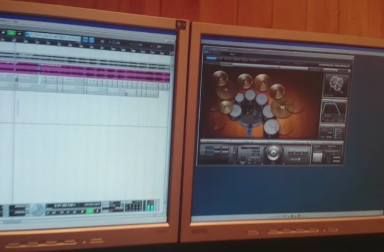 Un momento durante la programación de las baterías para el proyecto de Cuervo Rojo. Este proyecto es un LP de once temas que Antonio Palma está preparando en el estudio.